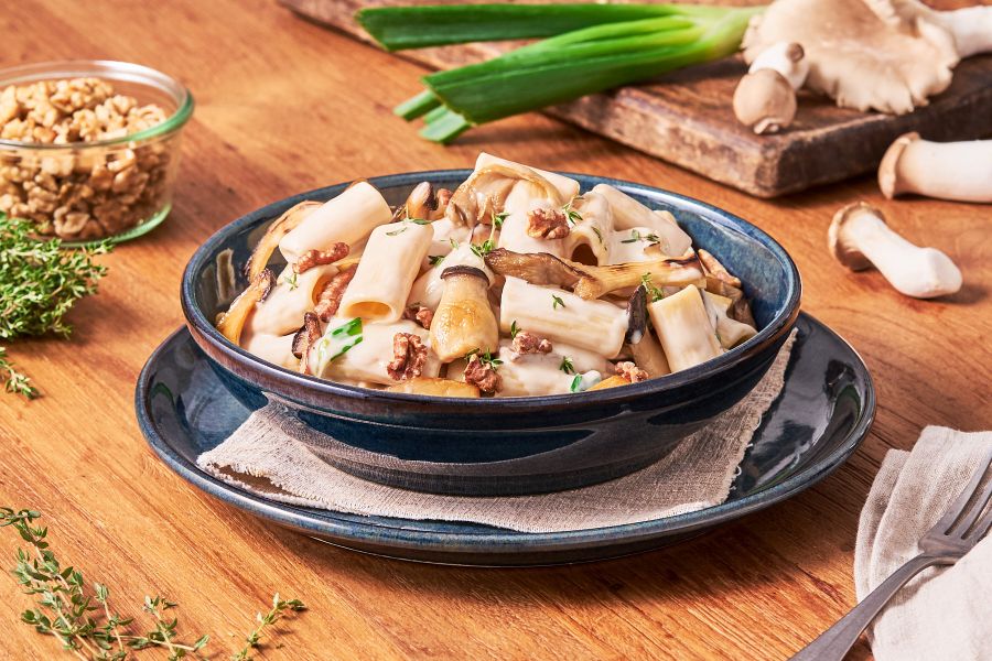 Feine Rigatoni an veganer Rahmsauce auf Basis unserer weissen Grundsauce. Veredelt mit aromatischen Pilzen, gerösteten Baumnüssen und frischem Thymian – harmonisch und ausgewogen im Geschmack.