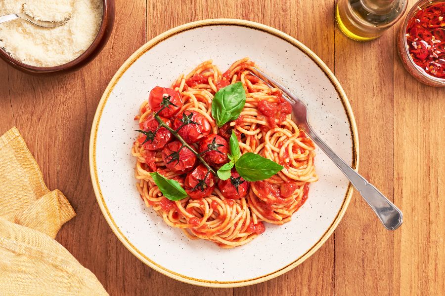 Spaghetti in aromatischer Tomatensauce, verfeinert mit ofengerösteten Cherrytomaten und frischem Basilikum. Ein schlichtes, ehrliches Gericht voller Geschmack und Wärme.